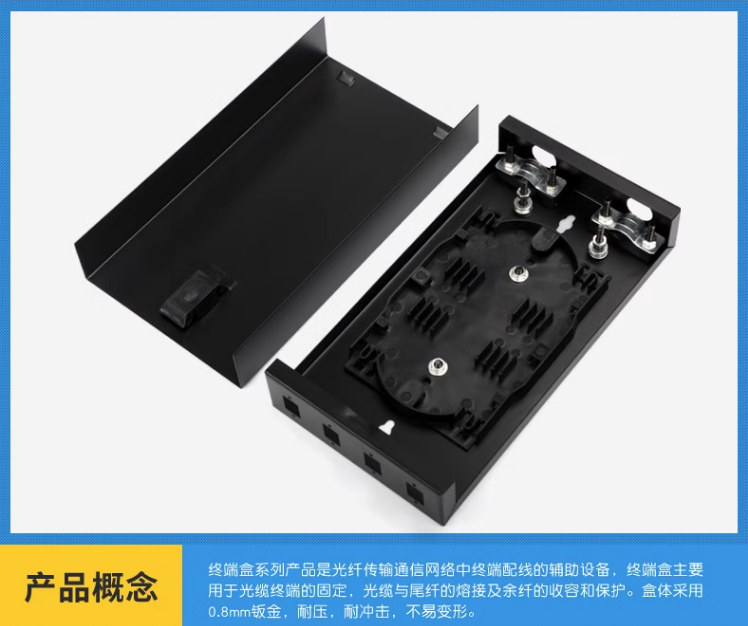 光纤终端盒是一条光缆的终接头,他的一头是光缆,另一头是尾纤,相当于是把一条光缆拆分成单条光纤的设备 ,安装在墙上的用户光缆终端盒,它的功能是提供光纤与光纤的熔接、光纤与尾纤的熔接以及光连接器的交接。并对光纤及其元件提供机械保护和环境保护,并允许进行适当的检查,使其保持最高标准的光纤管理。